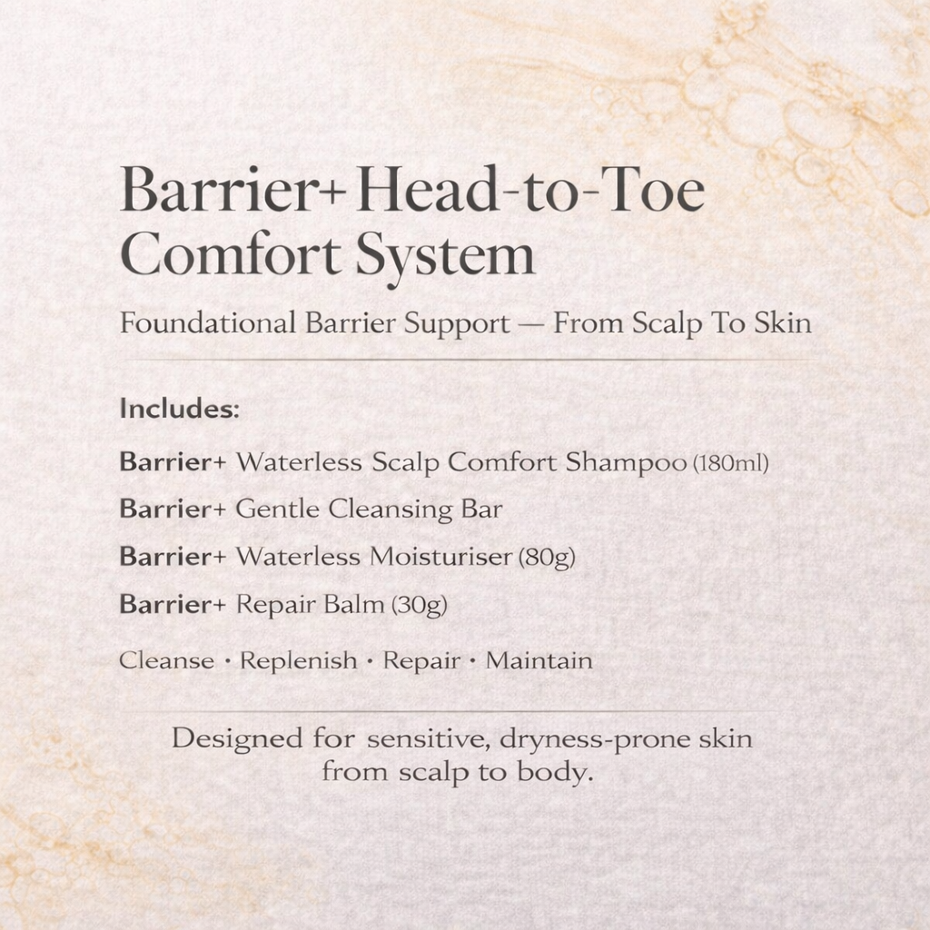 Each Starter Pack is built around the Barrier+ Skin Structure System — guiding your skin through cleanse, replenish, seal, and repair stages using true waterless formulations.
